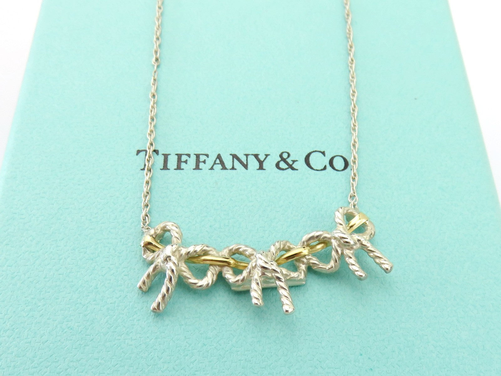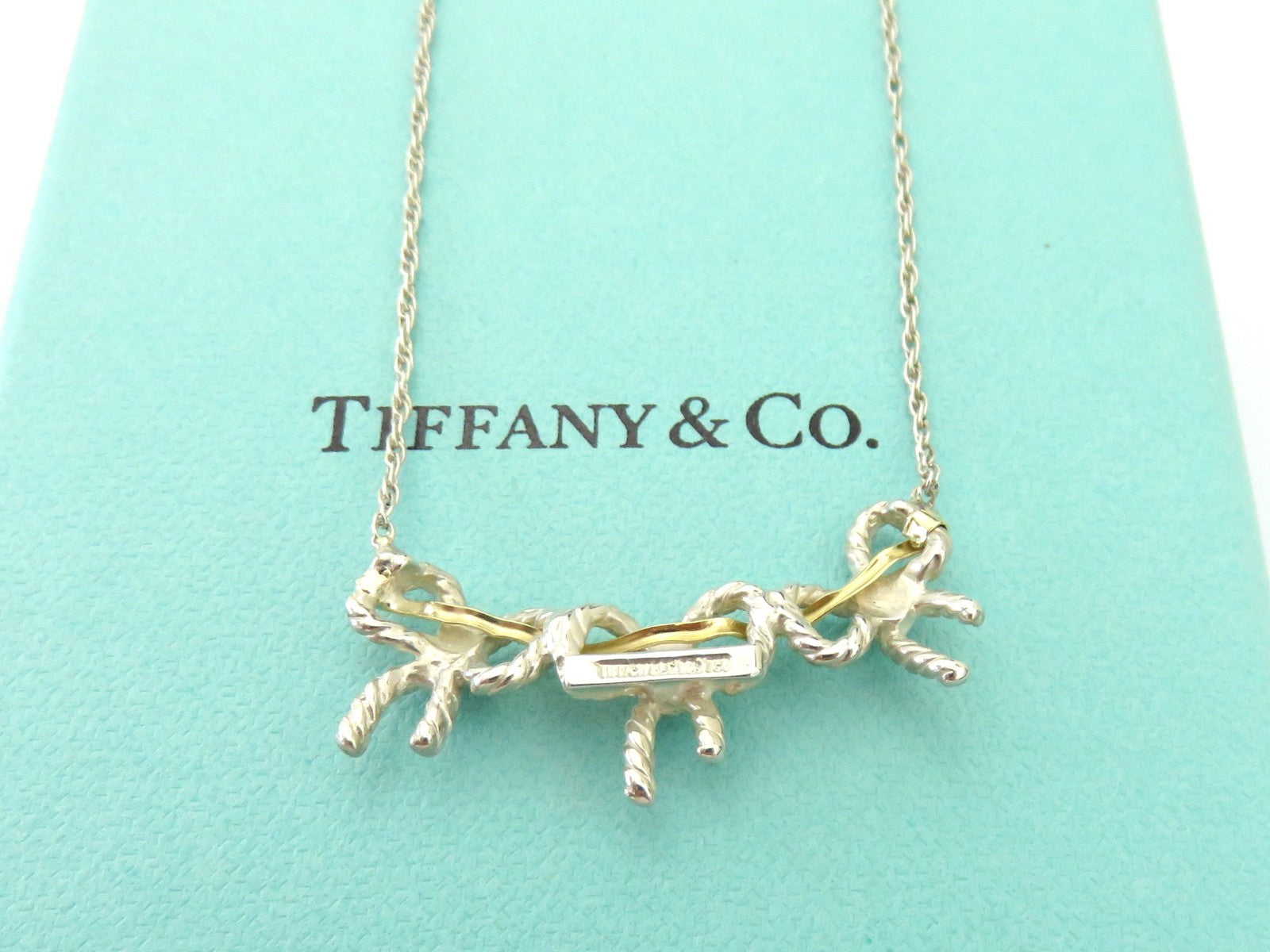 TIFFANY & CO Sterling Silver 18K Gold Triple Bow Ribbon Pendant Necklace
